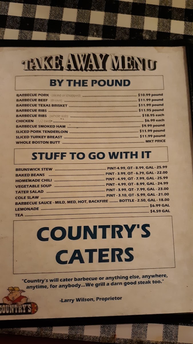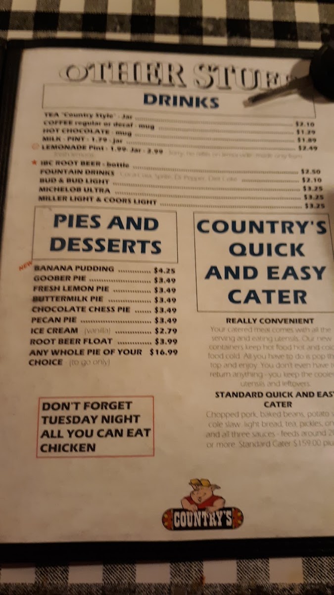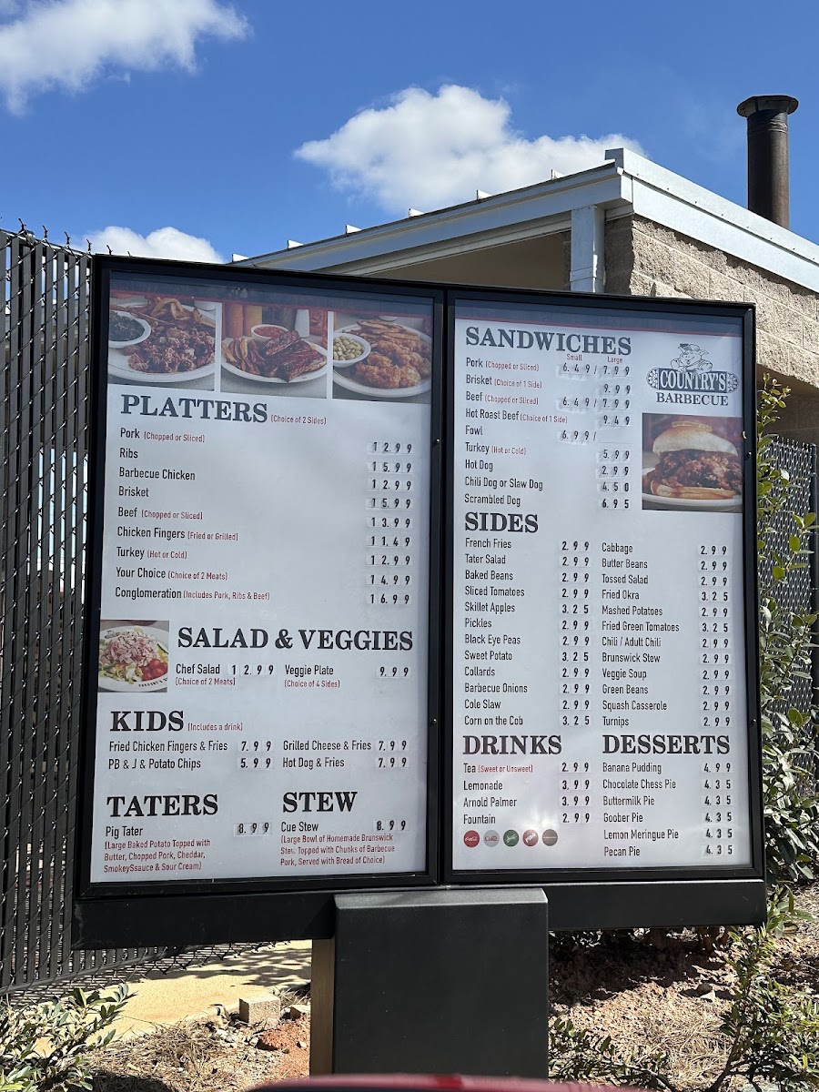 Welcome to Country's Barbecue, a beloved culinary gem located at 1021 Opelika Rd, Auburn, AL. Known for its deep roots in traditional Southern cooking, Country's offers a mouthwatering array of dishes that reflect the heart and soul of barbecue. The menu showcases warm comfort foods like fried chicken fingers and homemade hamburger steak, alongside popular BBQ sandwiches like the Texas beef brisket and chopped pork, all at great prices.